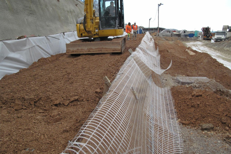 Izgradnja armirane brežine: Fe mreže, geomreže in kokos zastirka.